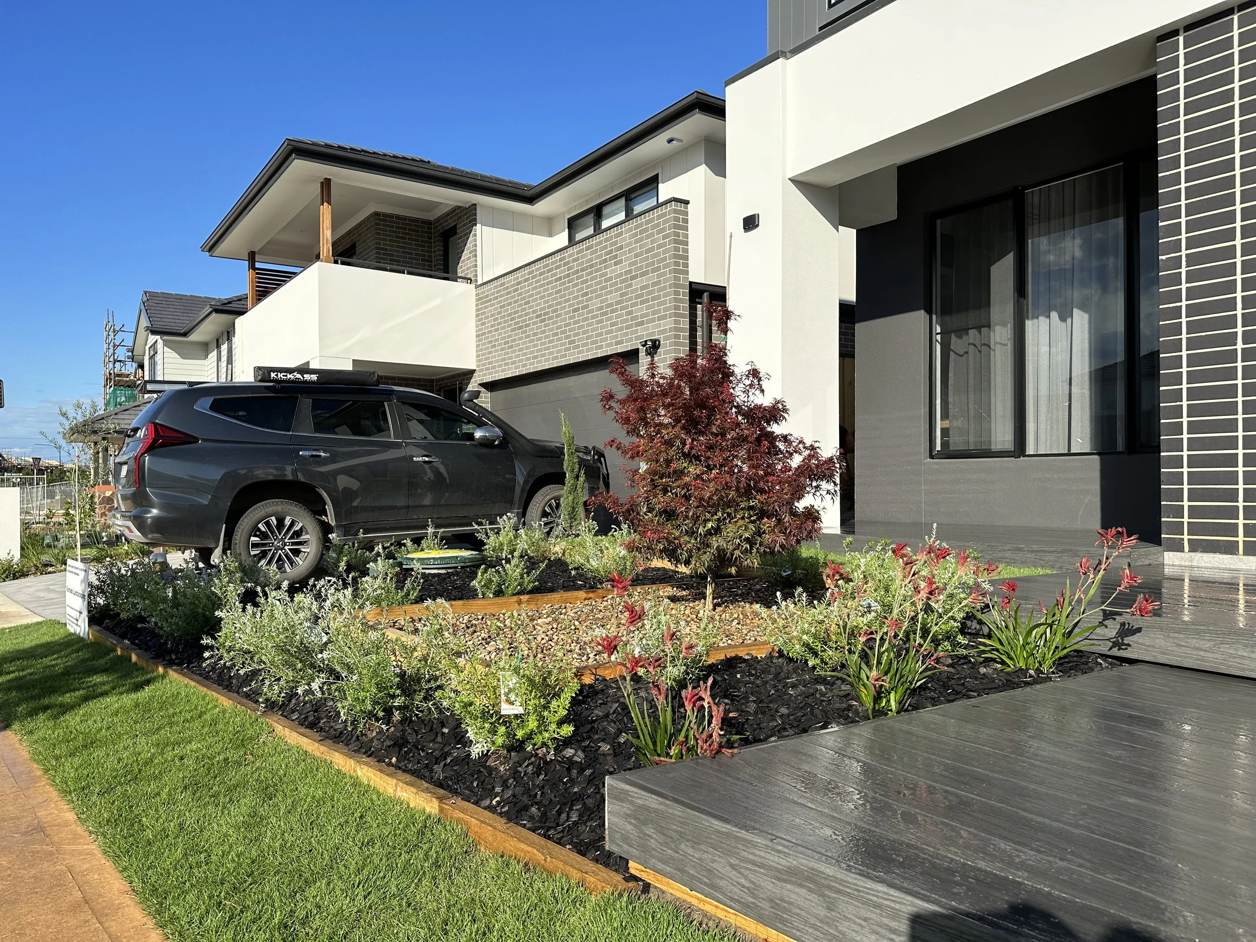 New Front Yard Landscaping including terracing, decking, garden beds and lawns - Gables NSW.