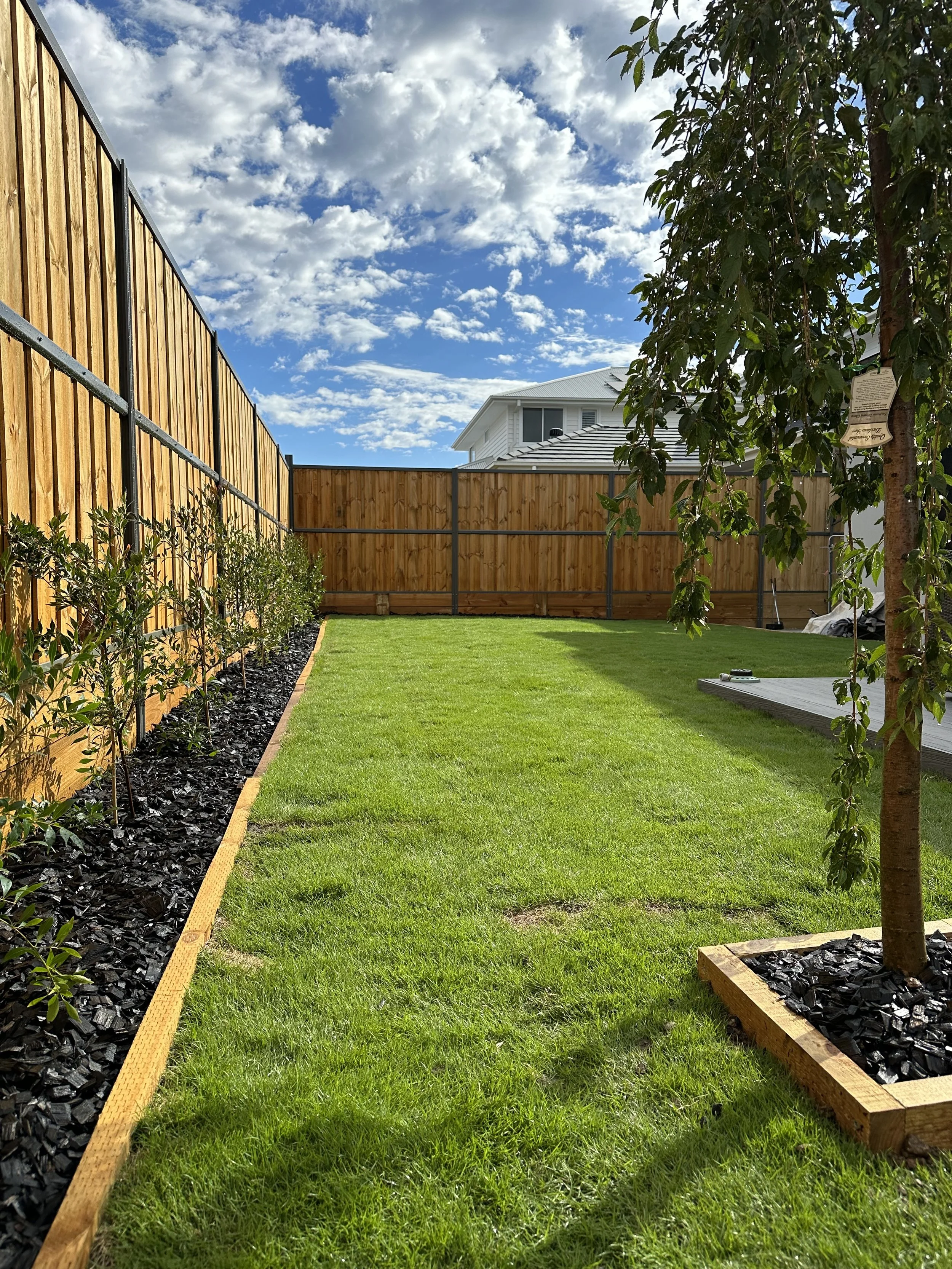 Rear Yard Landscaping including levelling, lawn laying, garden beds and timber decking. - Gables, NSW.